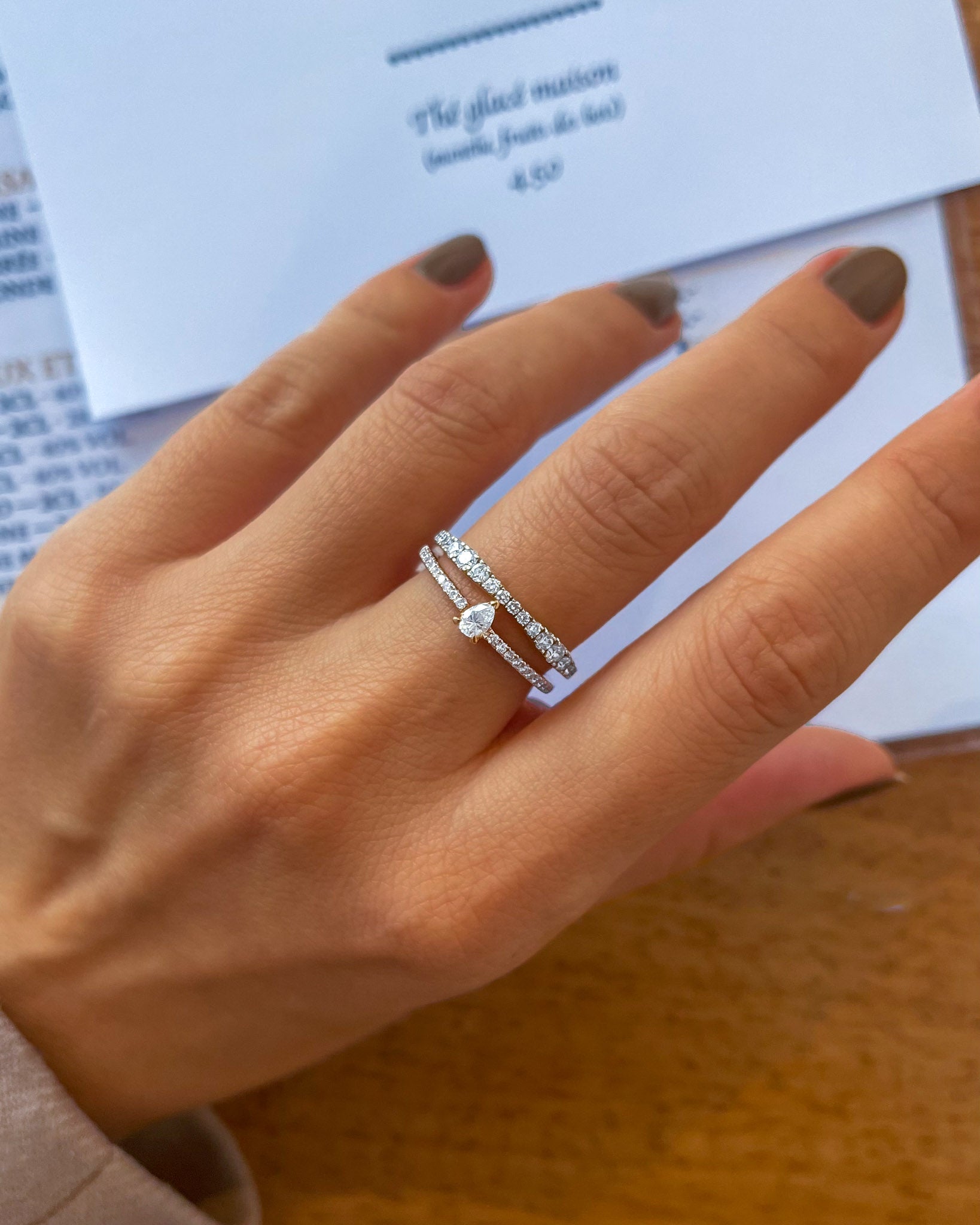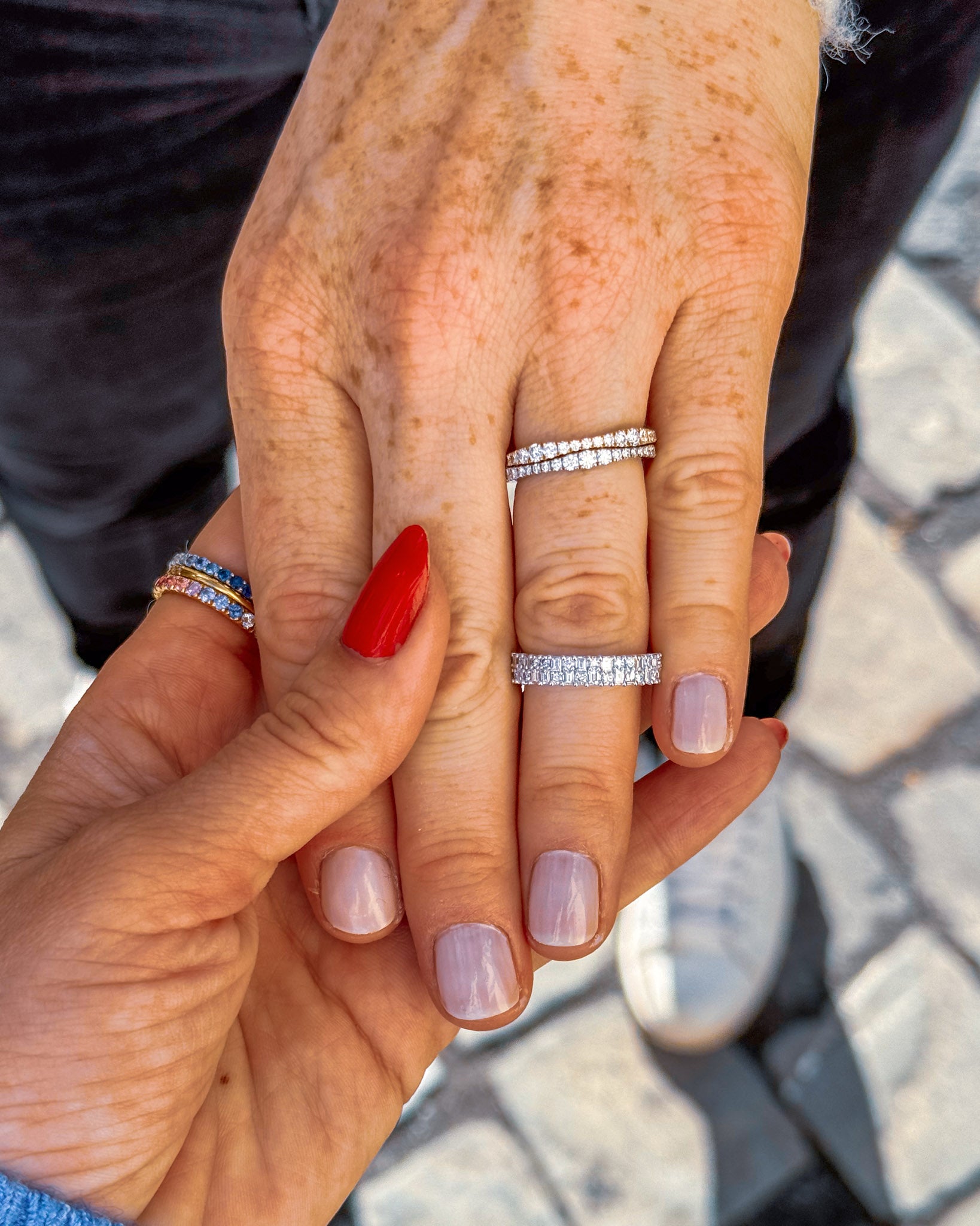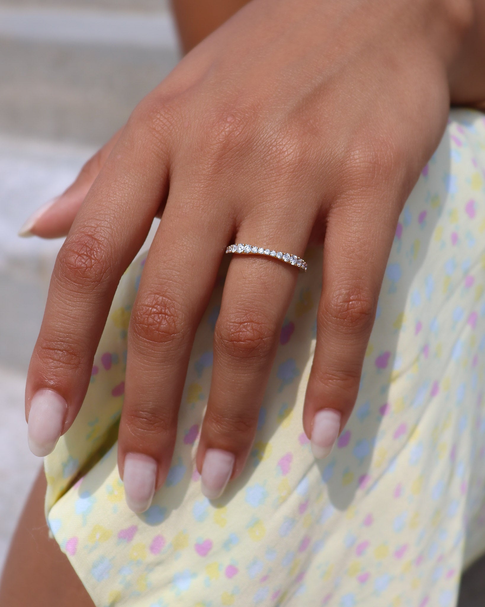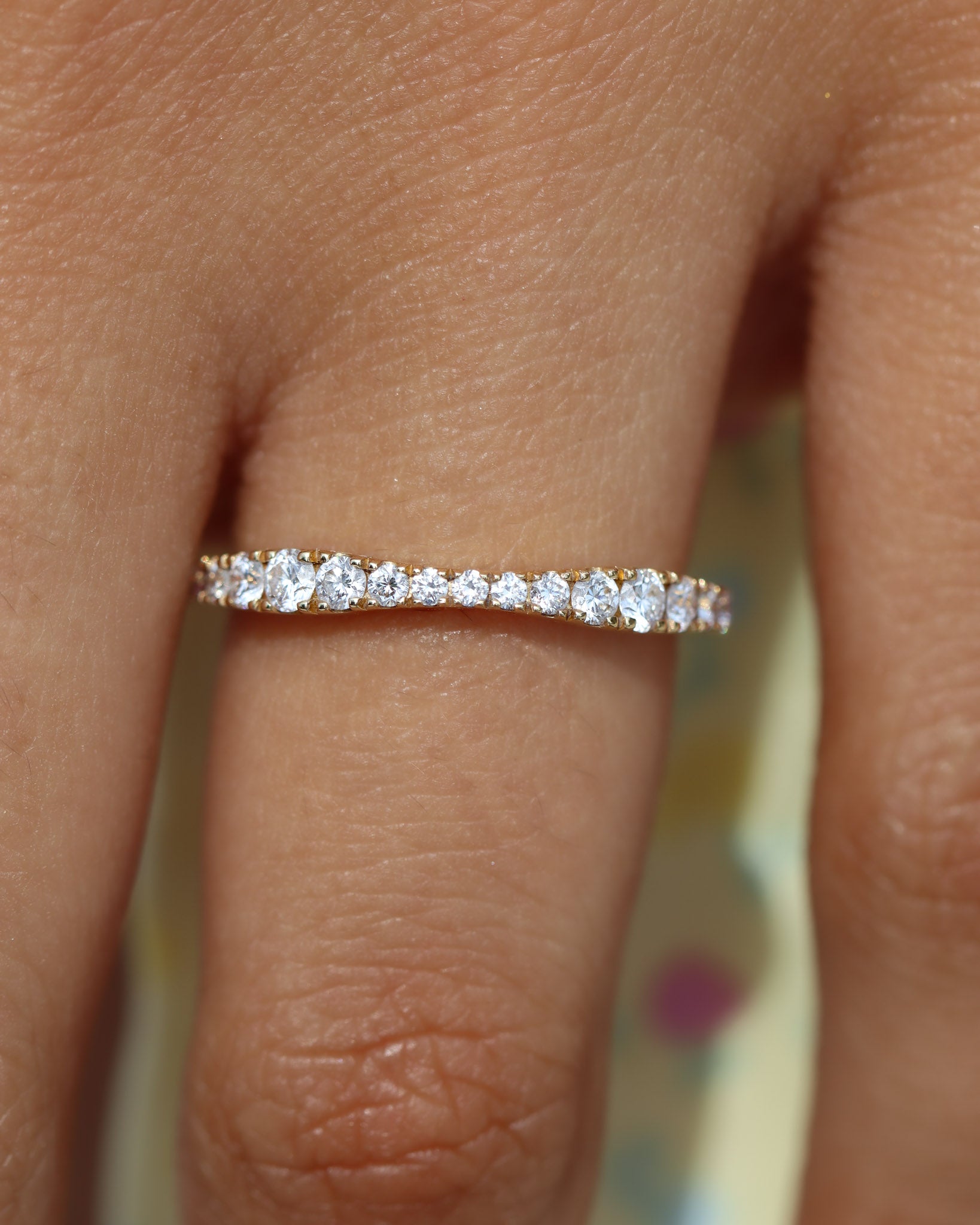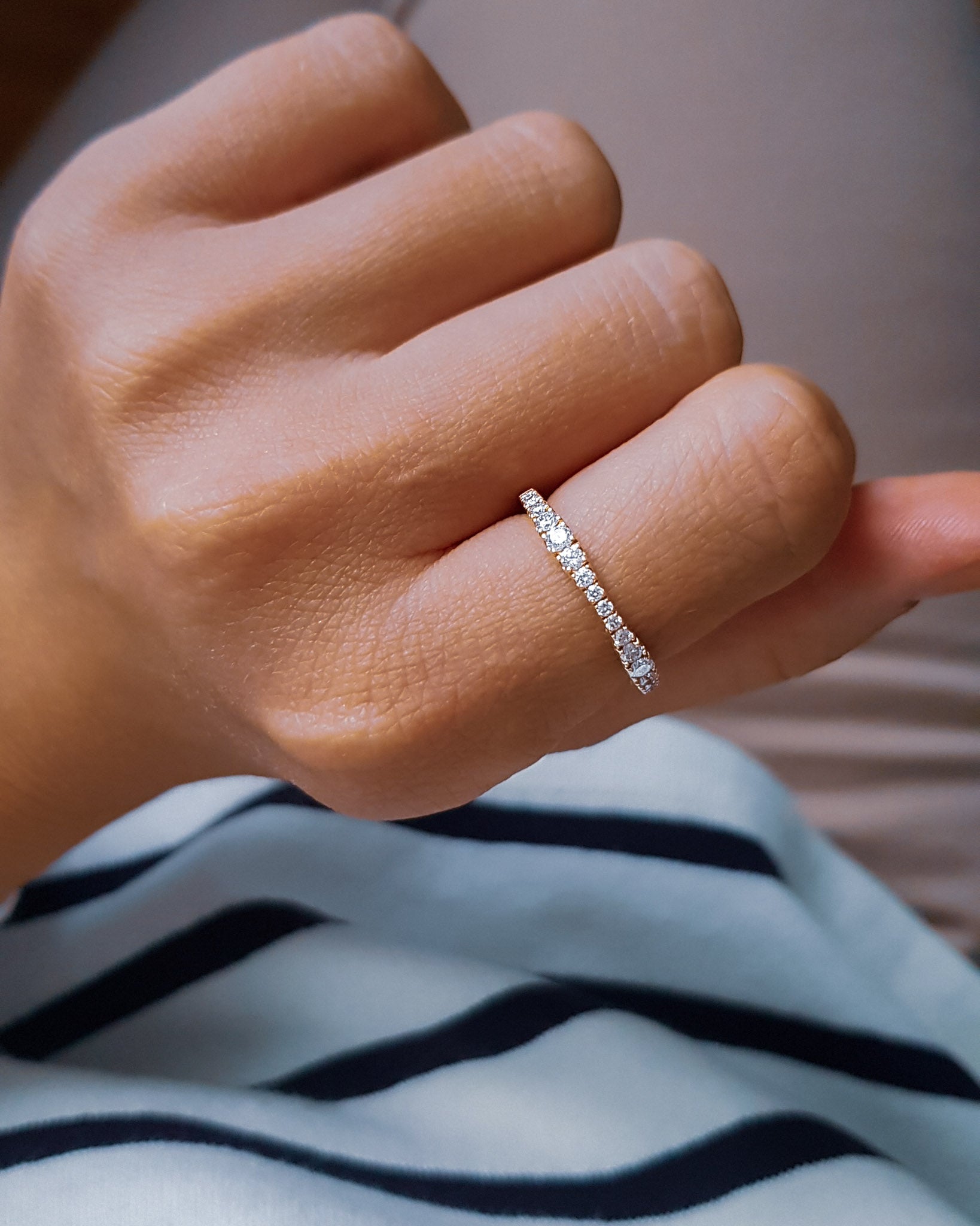 Halfway eternity rings feature gems on half of the ring’s circumference, allowing for comfortable wear and flexibility in resizing.