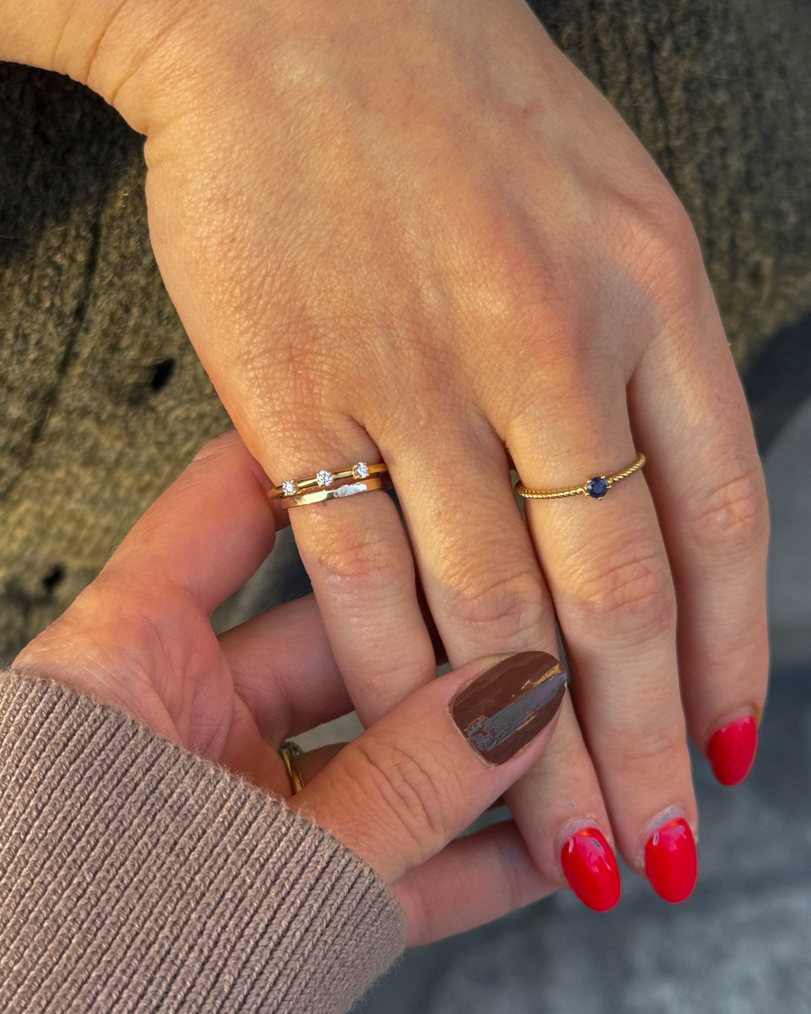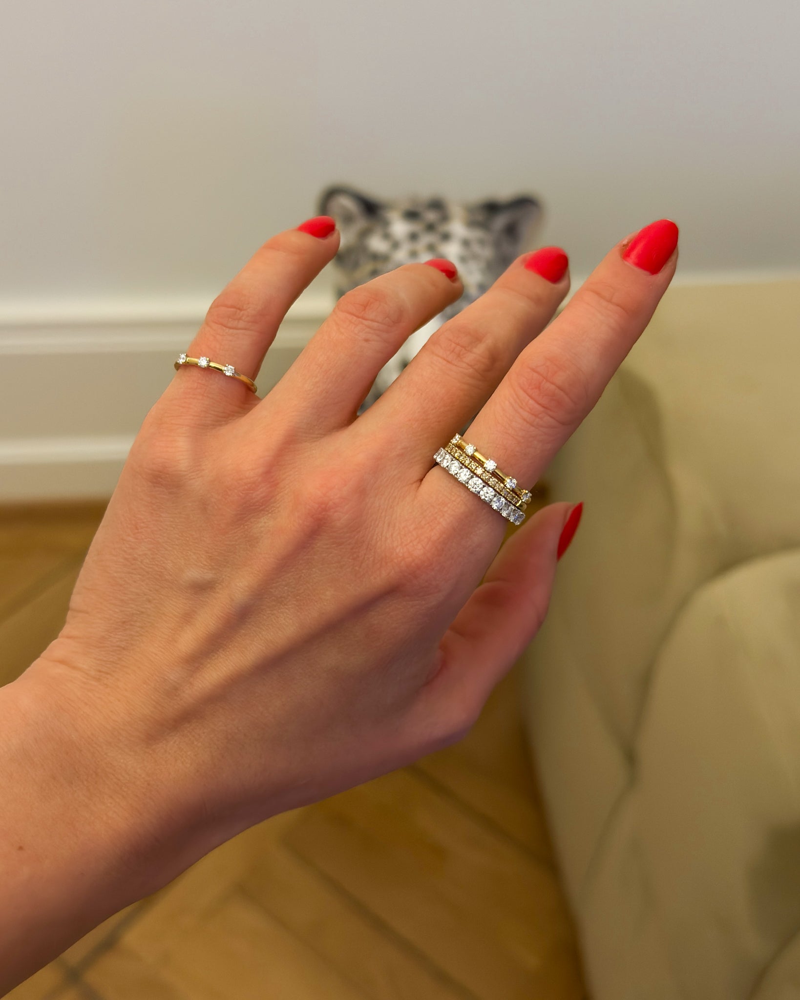 Halfway eternity rings feature gems on half of the ring’s circumference, allowing for comfortable wear and flexibility in resizing.