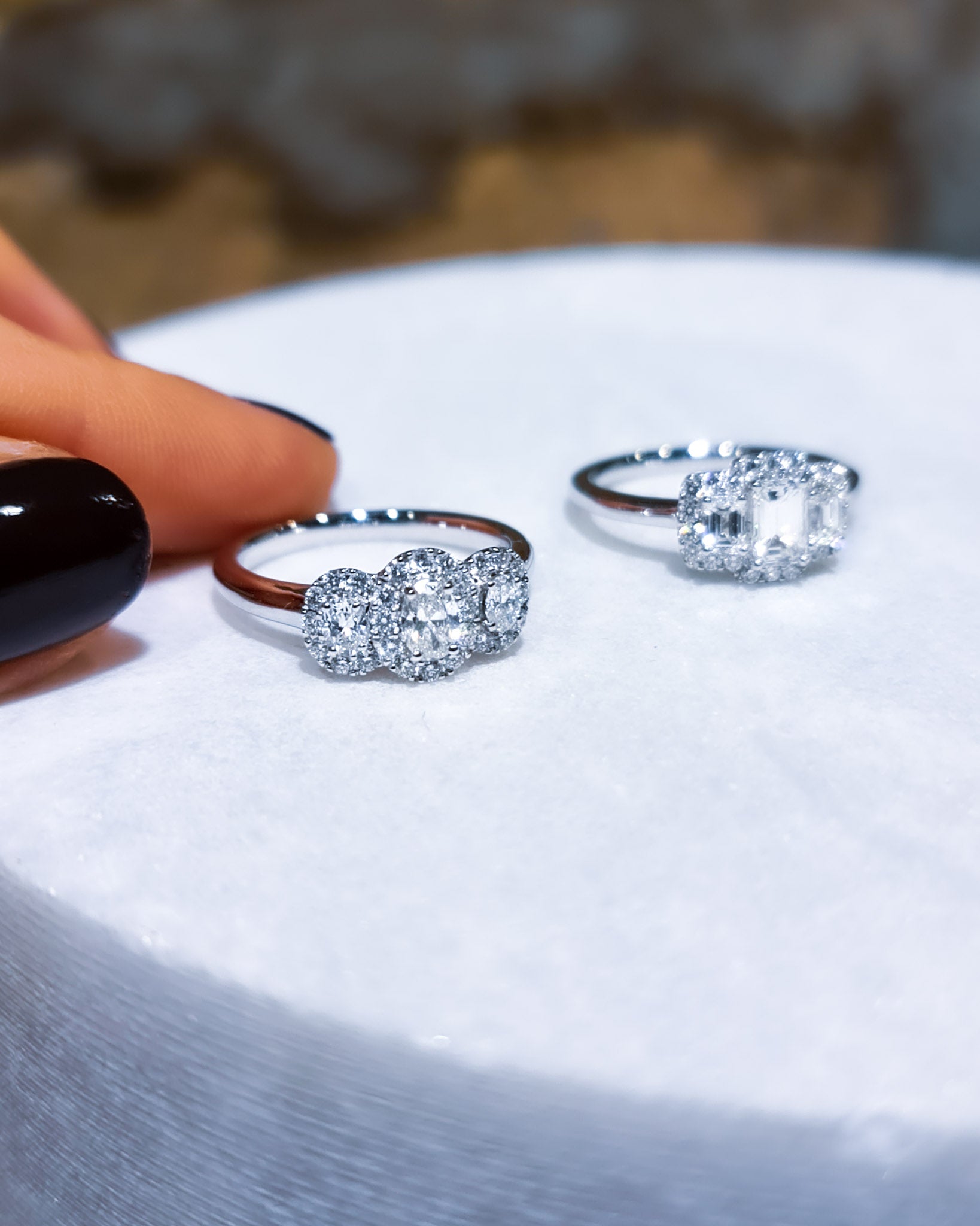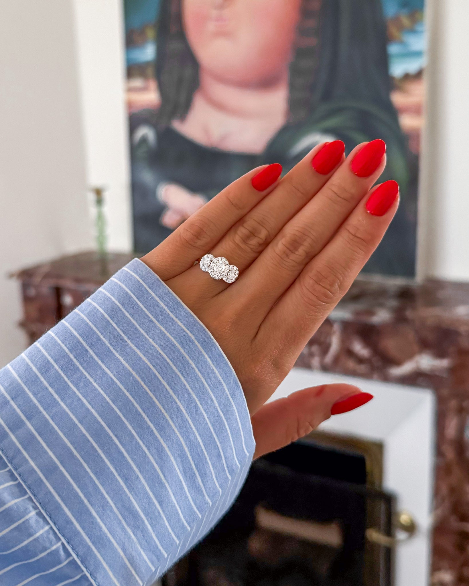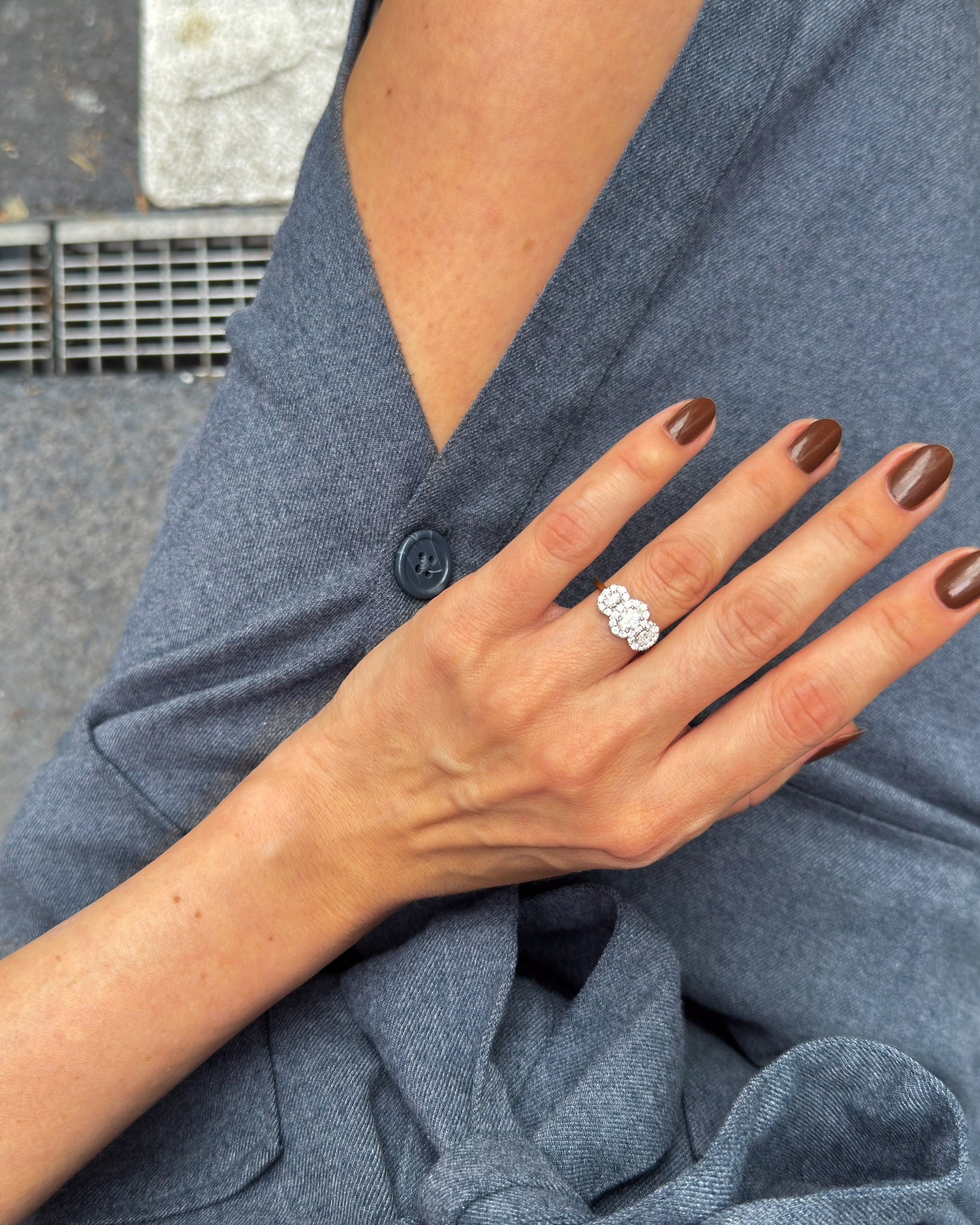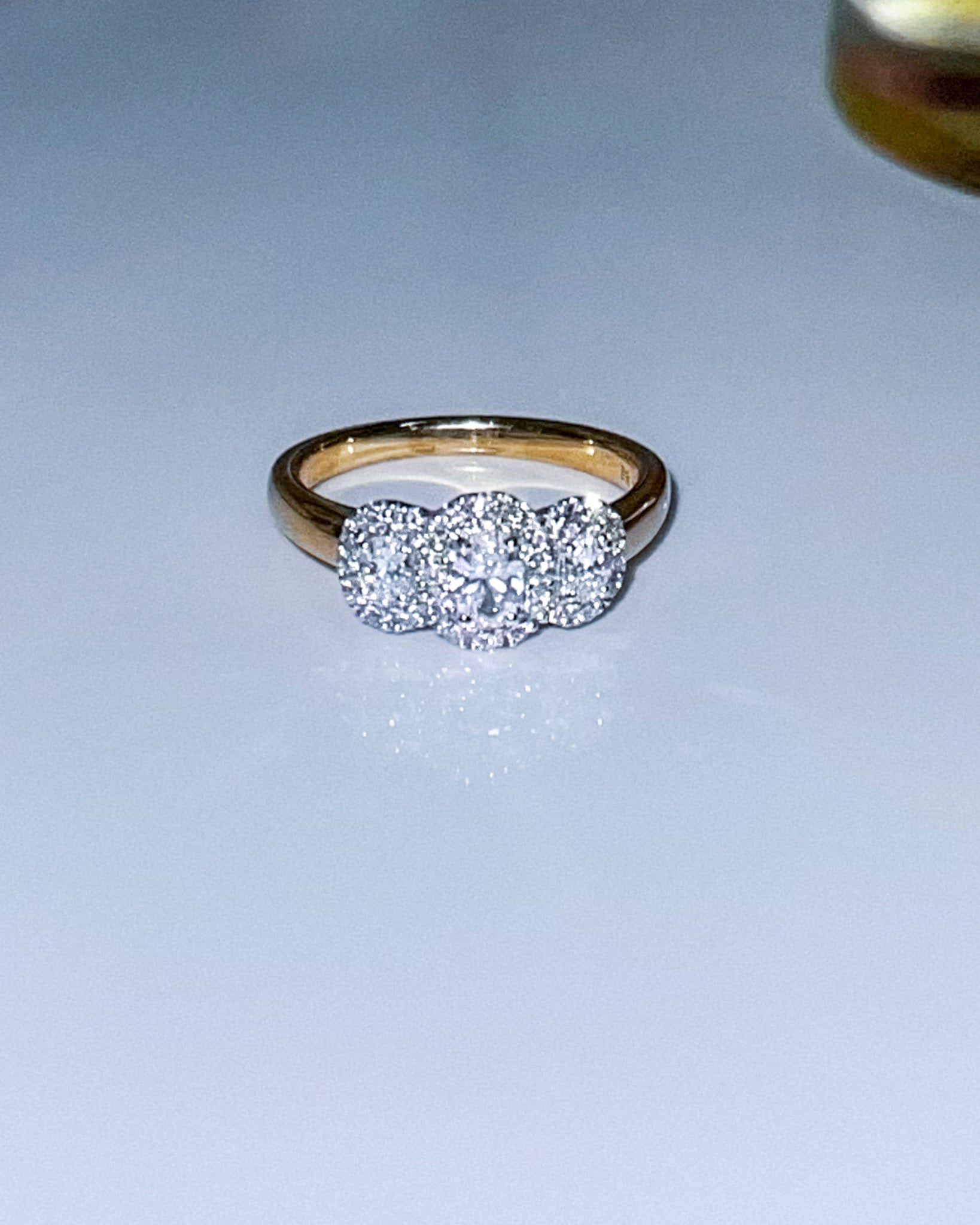 The Copenhagen engagement ring is set with three oval diamonds surrounded by a halo of round brilliant diamonds of the finest quality.