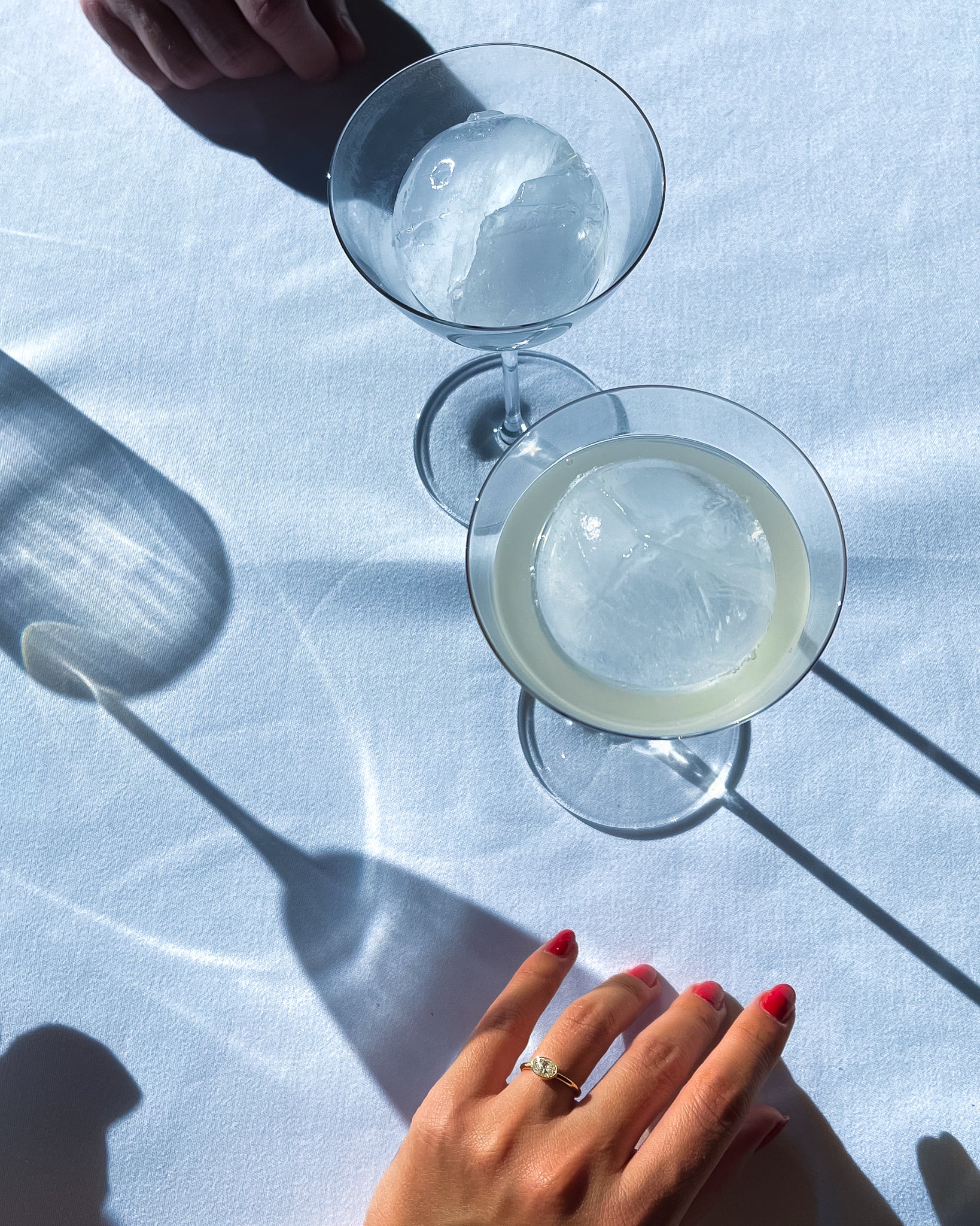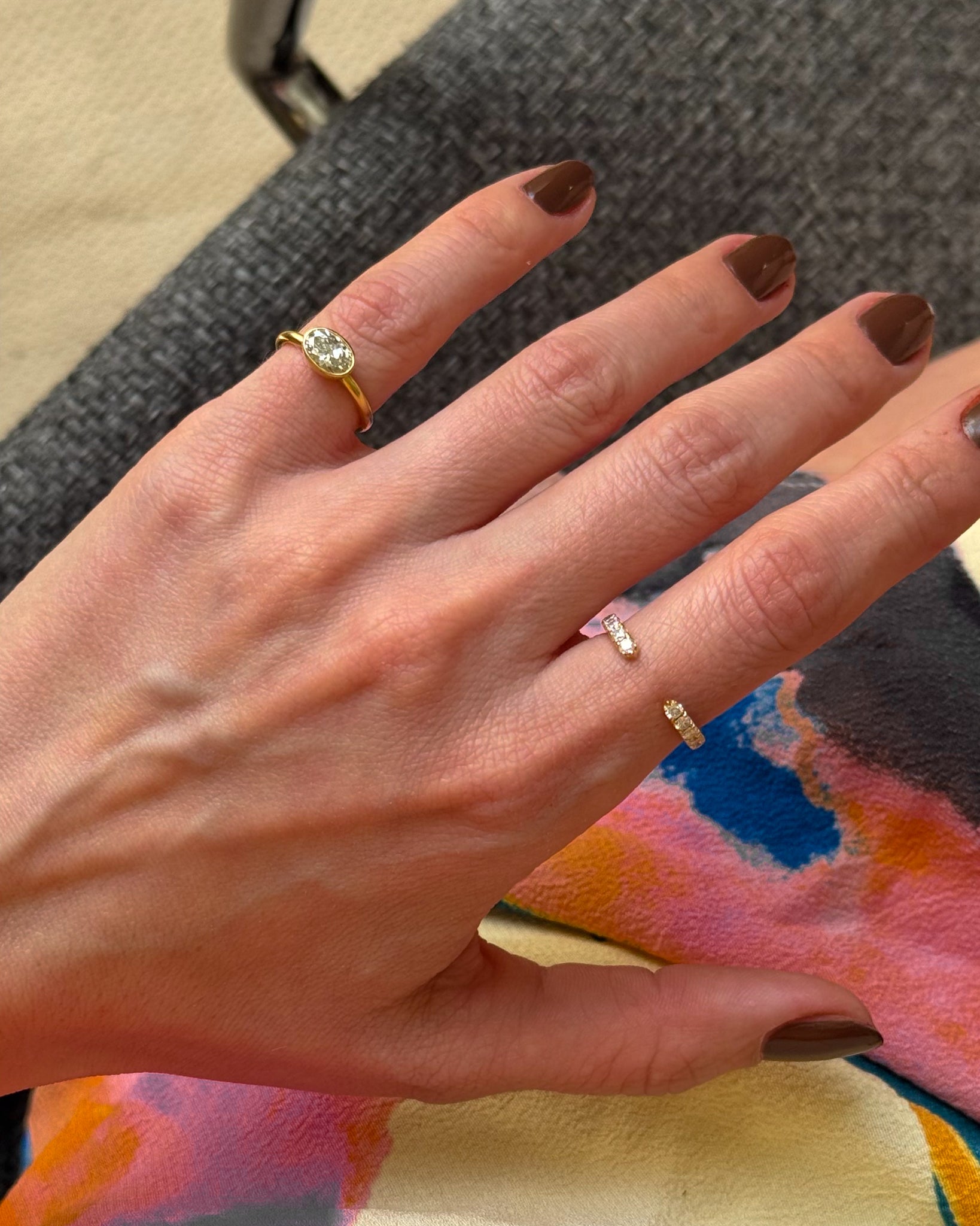 The east-west orientation of the diamond—set horizontally—adds a distinctive touch, enhancing its presence while maintaining an effortless, organic flow along the finger.