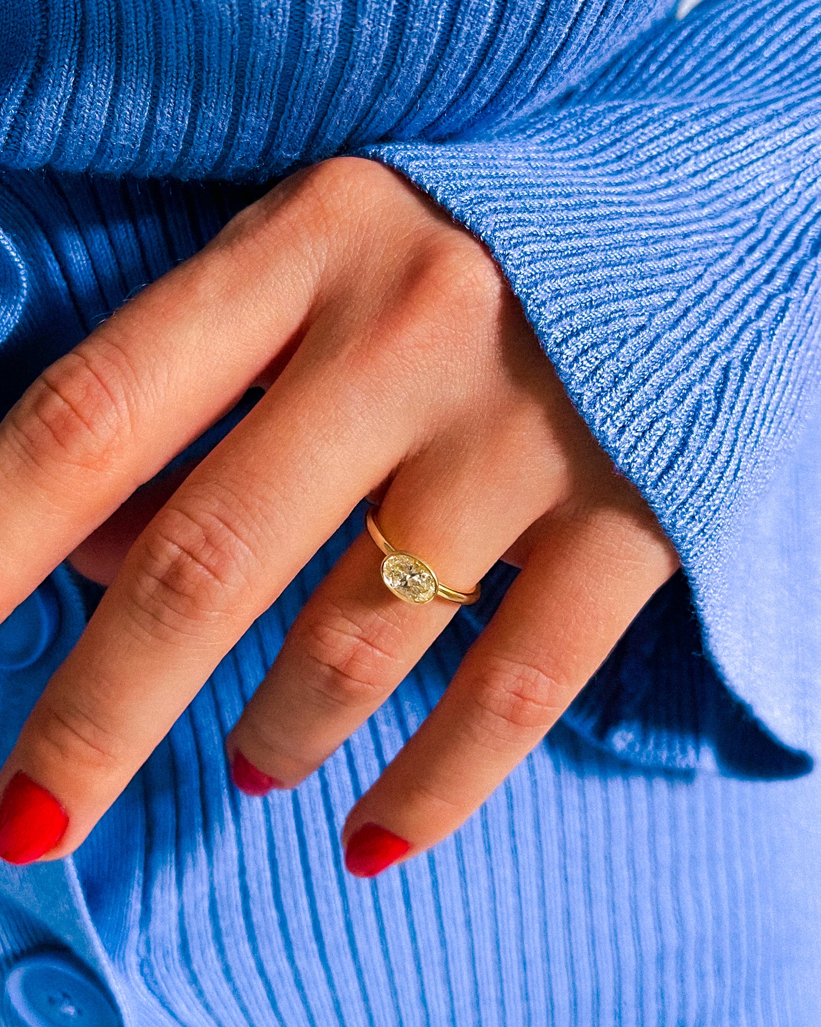 The Cuzco engagement ring features a 0.70-carat oval diamond with VVS2 clarity and a warm light yellow hue (S–T range) is carefully nestled in a sleek bezel setting, offering a seamless, modern silhouette. GIA Certified