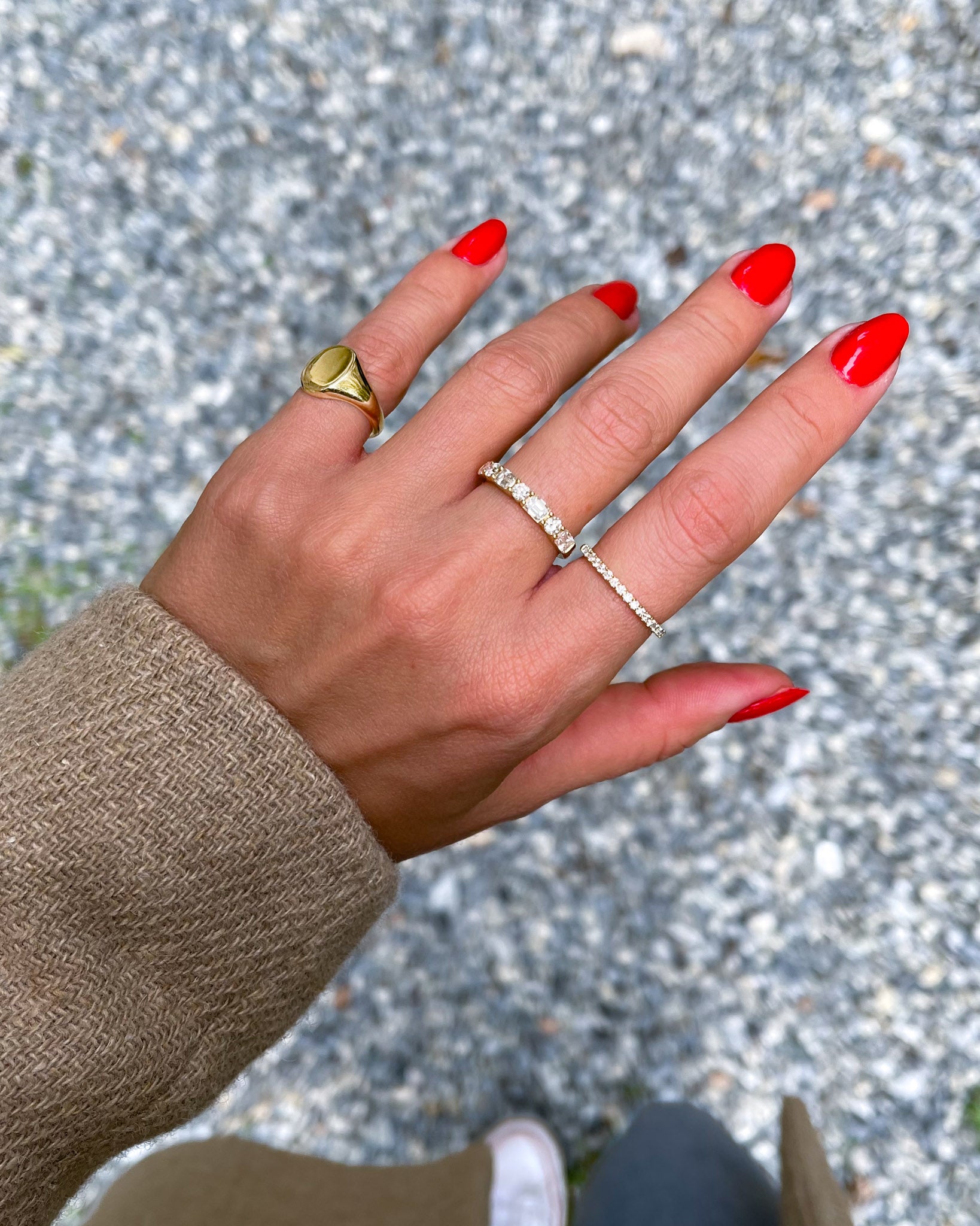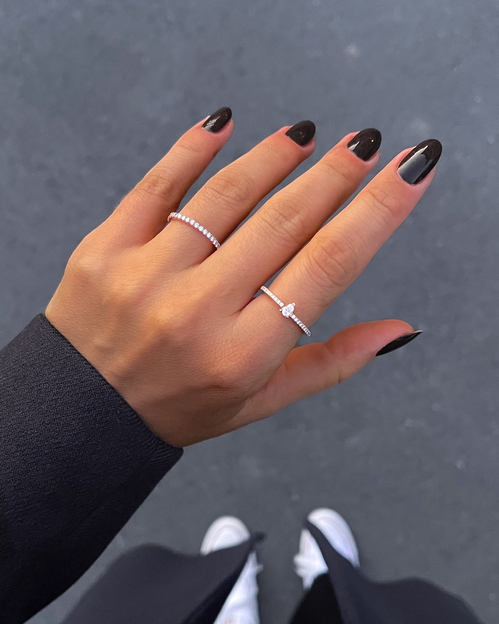 Halfway eternity rings feature gems on half of the ring’s circumference, allowing for comfortable wear and flexibility in resizing.