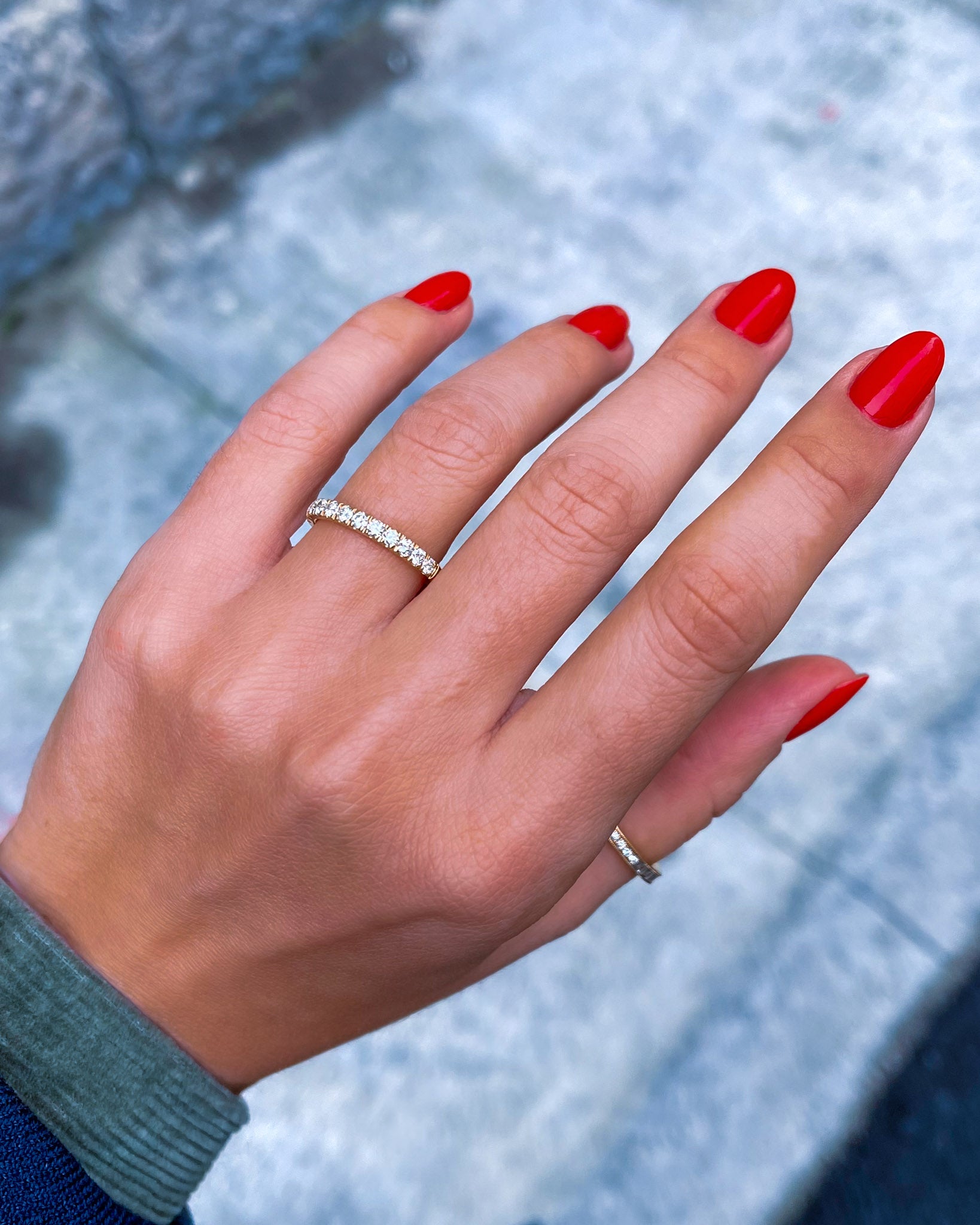 Halfway eternity rings feature gems on half of the ring’s circumference, allowing for comfortable wear and flexibility in resizing.